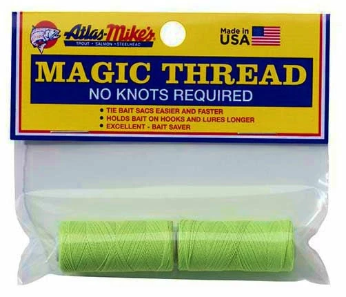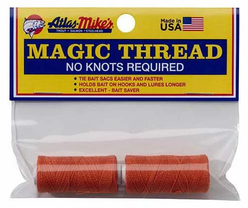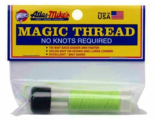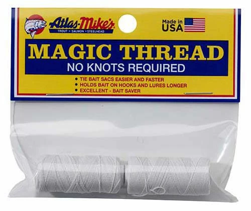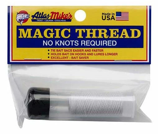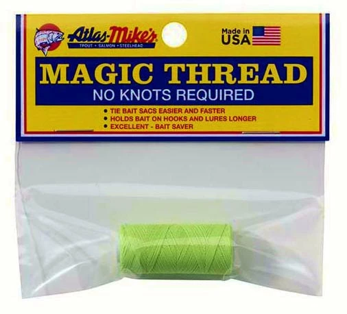 Atlas “Magic Thread” makes sac tying easier and faster. Just three turns around the stem of the sac, pull tightly; three more turns and pull tightly again. That’s all! No knotting required! Simple and effective, it’s also an excellent bait saver. Wrap around the bait on hook or lures to hold bait on longer. (Works great on shrimp, herring, sardine, salmon roe, crayfish, prawn, etc.) Single packs are 100 feet.
