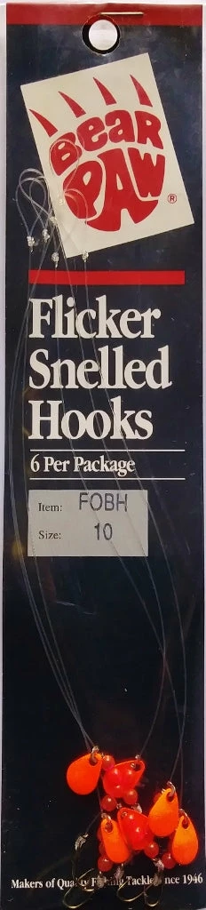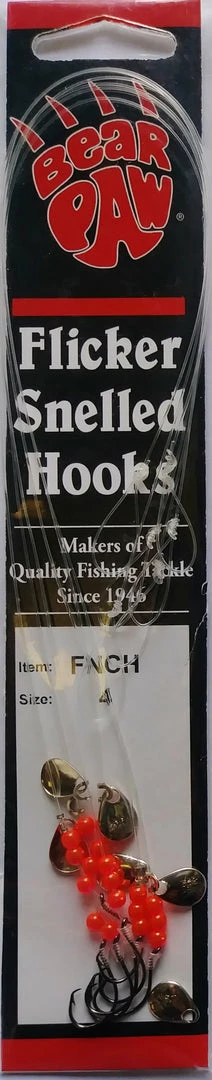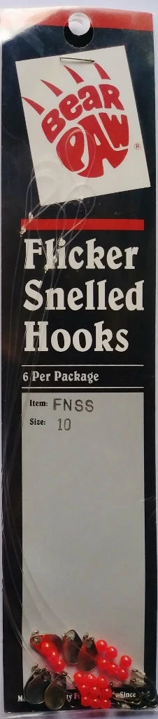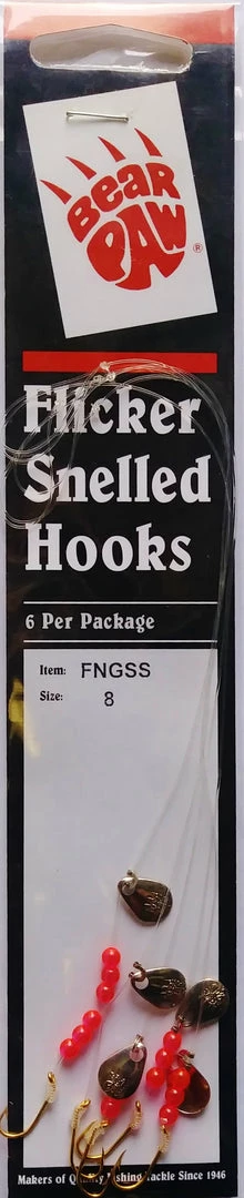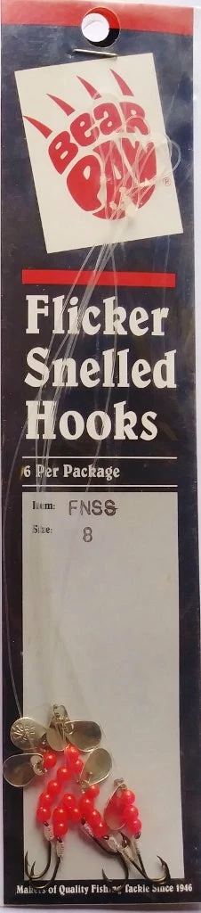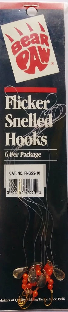 Bear Pawâs popular Flicker Snelled Hooks are hand tied using either 8â or 12″ monofilament or nylon-coated, stainless-steel wire leaders. We have them in a variety of styles, sizes, and colors. All Flicker Snelled Hooks use brilliant fluorescent red beads and personalized spinner blades, sized and balanced to hook size for superior action. Spinner blade finishes vary.