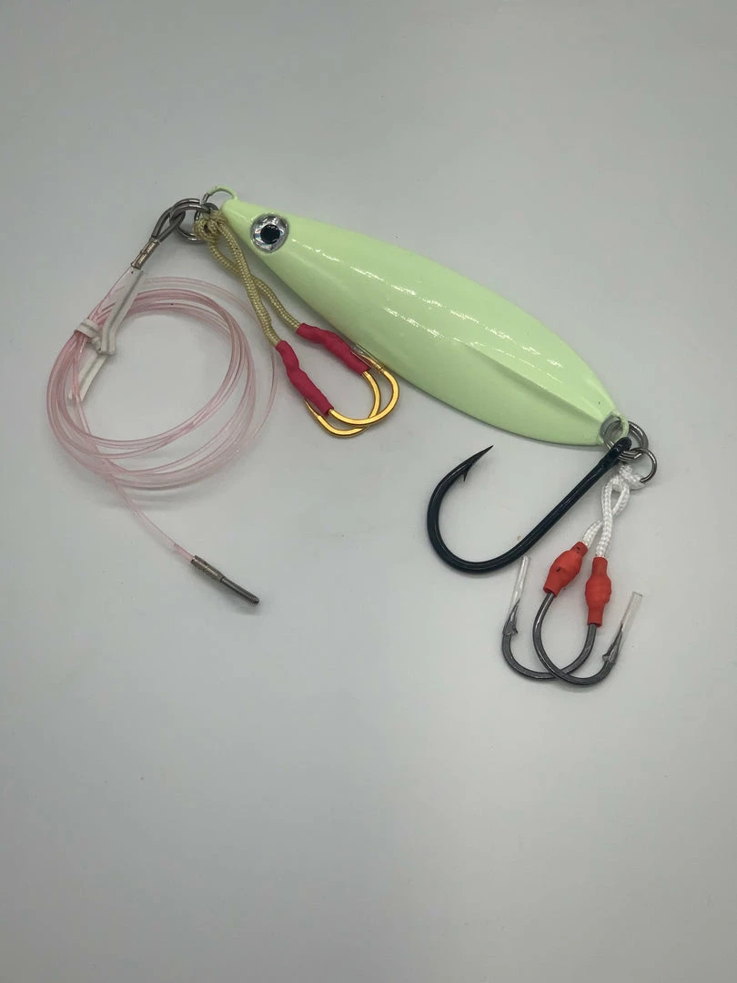 Want to hook that monster tuna, and get it to the boat? This jig is for you! What we have made for you here is a 350g glow flat-fall. We call it the “Monster Flat-Fall,” and it’s rigged with 200lb fluorocarbon, two sets of assists and one 8/0 Owner Jobu to finish it off. If you would like 300lb leader, this can be requested for an additional cost.Â