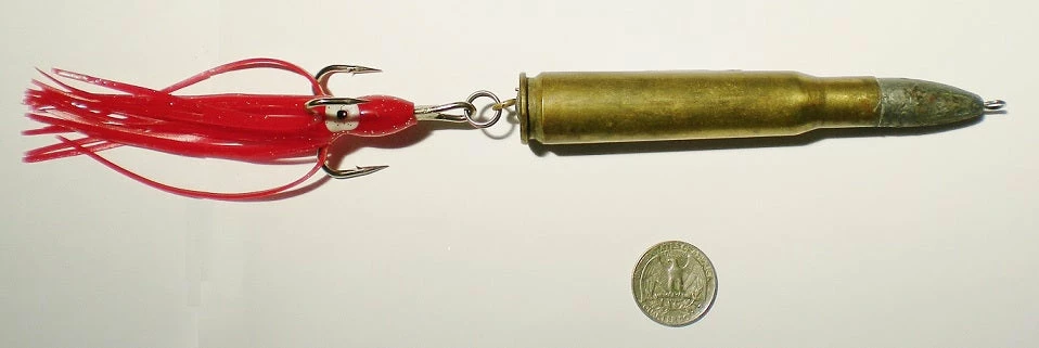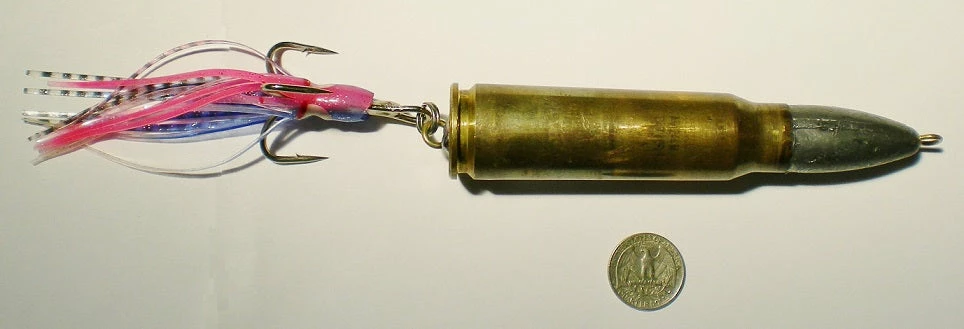 Ready? Aim – FISH? These amazing lures are designed with the cartridges of 20mm and .50 Caliber brass shells. They are heavy, shaped right for a fast sink, and have plenty of action to get the laziest fish motivated and the biggest fish to bite! All styles are rigged with a “moving tentacles” hoochie. Find out for yourself why these are rapidly becoming one of the favorite jigs on the California Coast! Excellent for Ling Cod, Rockfish, Halibut and whatever else that’s down there on the bottom!