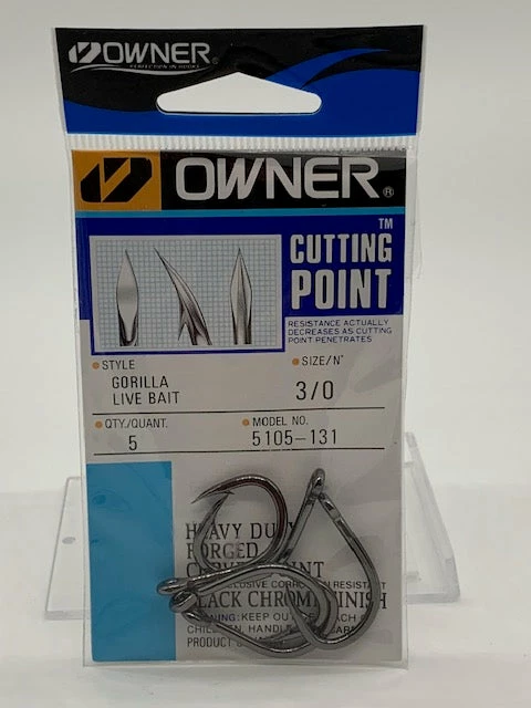 Gorilla hooks are the ultimate live-bait hooks for saltwater fishing! Features include a heavy-duty, XXX strong forged shank, Cutting Point®, and corrosion resistant black chrome finish. Ideal for rigging mackerel, squid and other large baits.