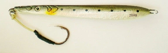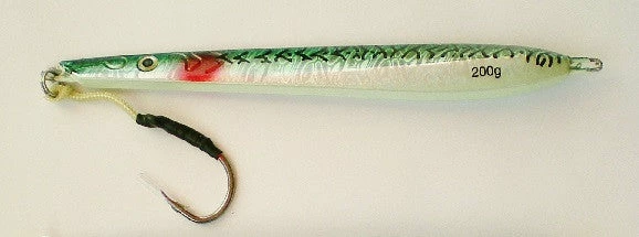 This lure is great for large Rockfish and Lingcod, as well as other saltwater offshore applications. Great for jigging, Dragging, and trolling. Weighs 200 grams. Available in Silver/Black Sardine, Silver/Blue, and Silver/Mackerel. Knife Shape helps the jig drop straight down. Assist Hook Braided Line is rated at 300 Lbs.